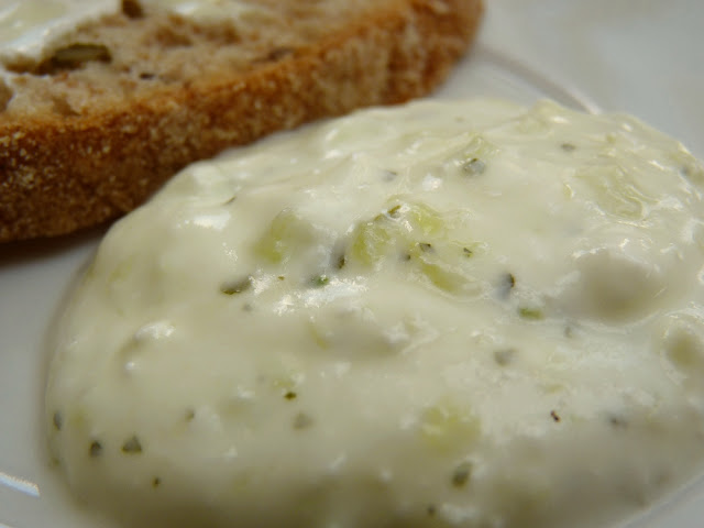 Pelar o pepino, cortar às rodelas e secá-lo bem. Cortar o pepino em pedaços pequenos e juntar o alho e as ervas picadas, misturar o iogurte, a pimenta, duas colheres de sopa de azeite, o sumo de limão e sal caso se verifique necessário. Mexer bem e servir bem fresco. Pode ser usado como aperitivo, para barrar no pão e em tostas, eu uso-o como molho para carne grelhada.